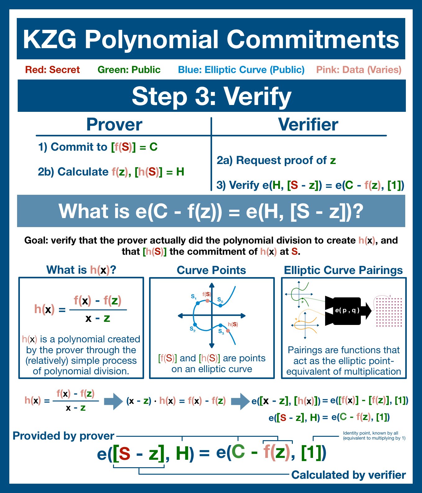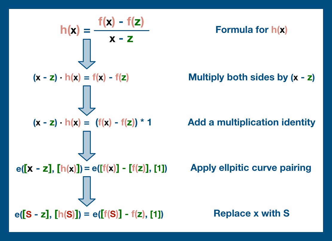 - Step 4: the prover uses a pairing to double check that these two items were correctly calculated, using the commitment as a reference.