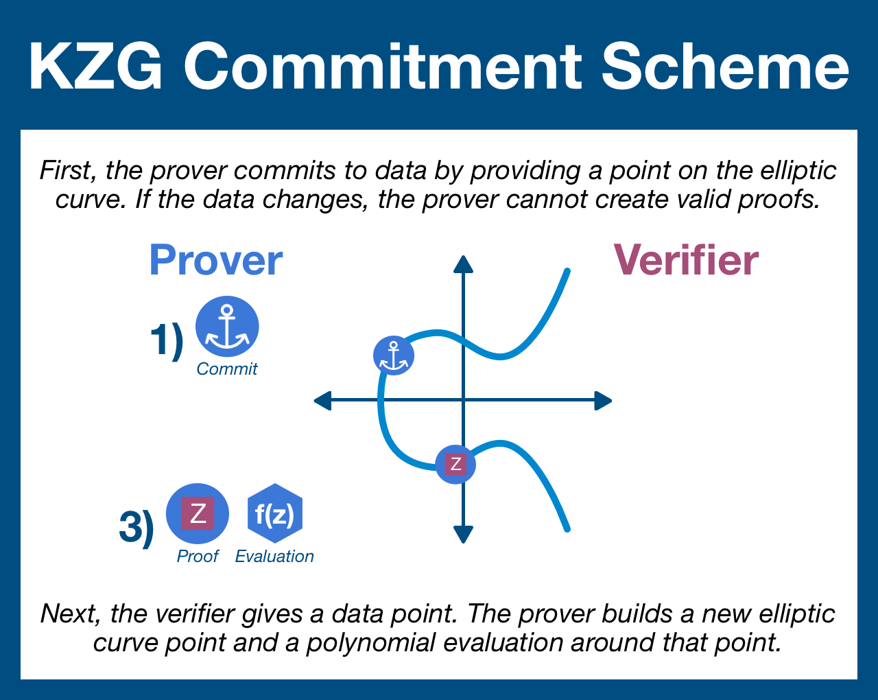 - Step 3: the prover comes back with two items, a curve point chosen using the prover's requested data point and an evaluation