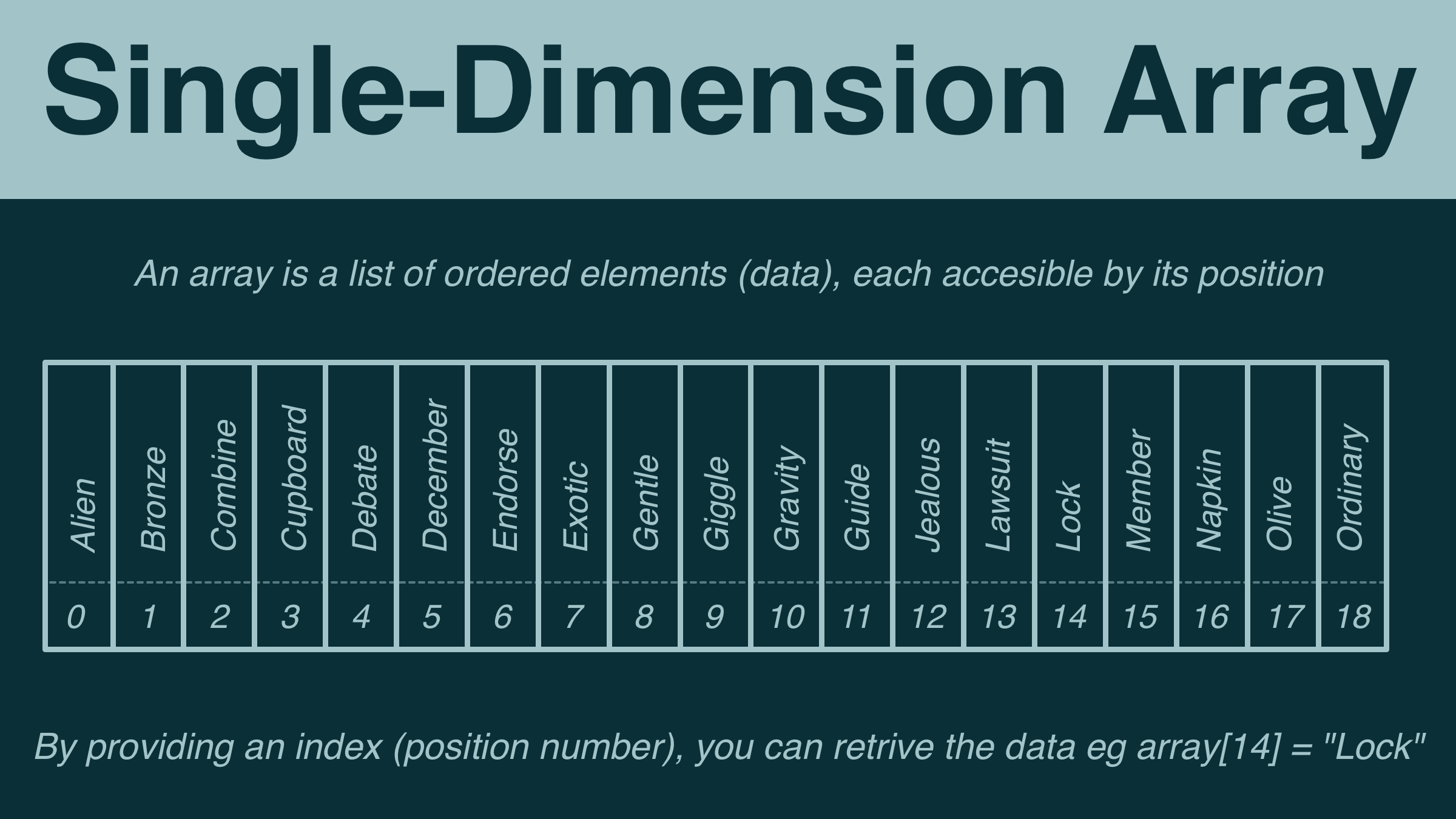 The most basic kind of array is a single-dimensional array. Elements are listed in order and can be accessed using its position.