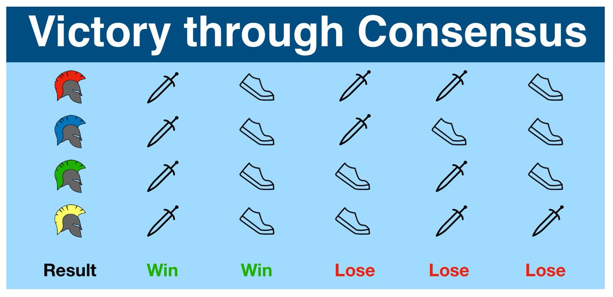 The Byzantine Generals Problem was introduced by an academic paper in 1982. It describes a game theory problem that shows how difficult it can be for dispersed parties to reach an agreement (consensus) without help of a trusted central party.