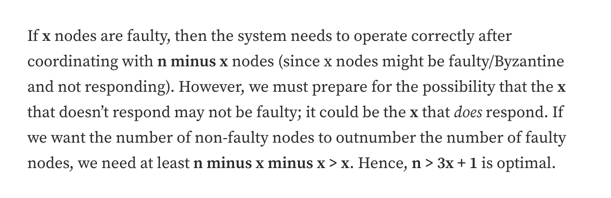 - Liveness - the system must be able to eventually come to consensus and progress forward
