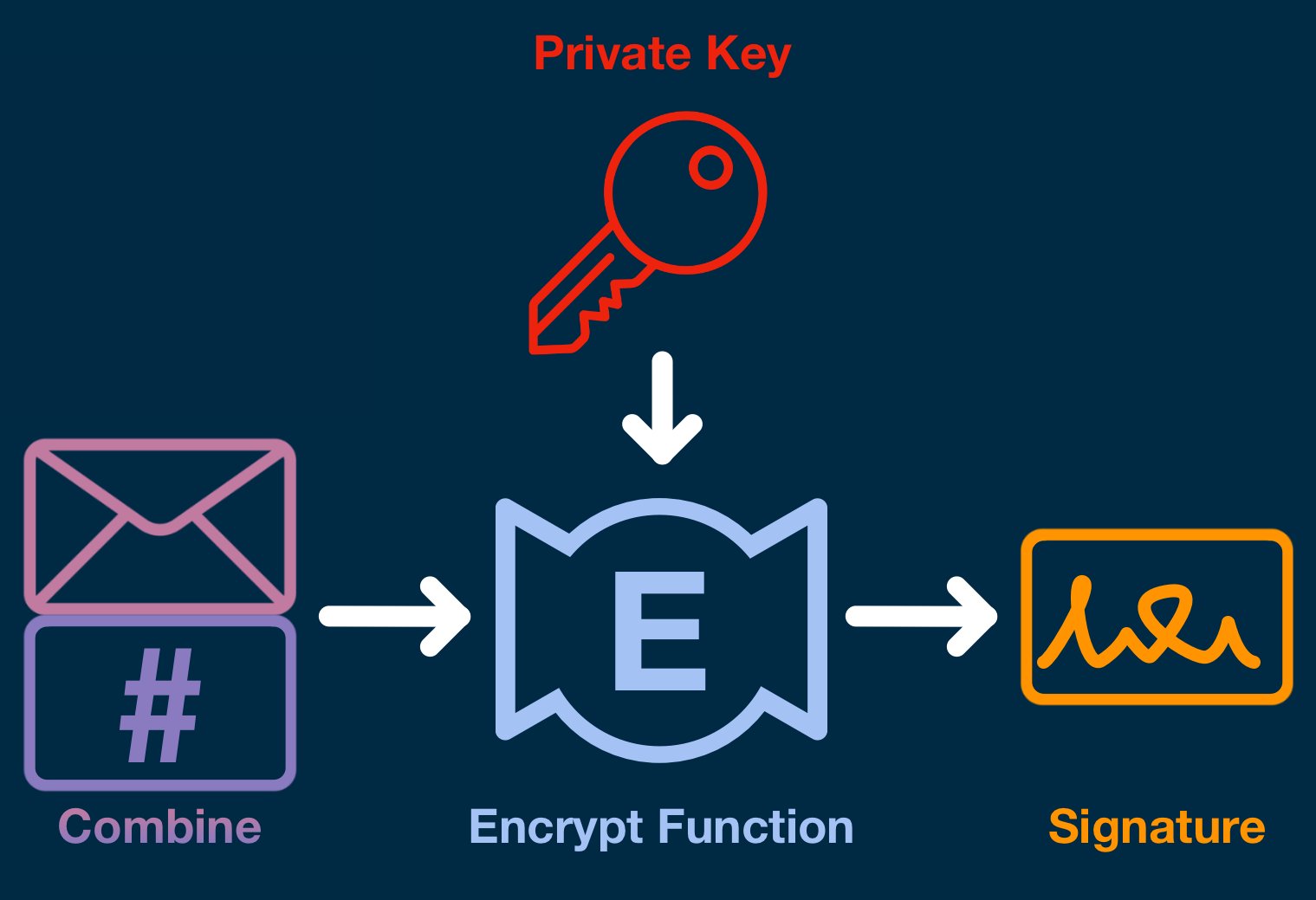 The combined message-hash and the signer's private key are fed into the encrypt function.