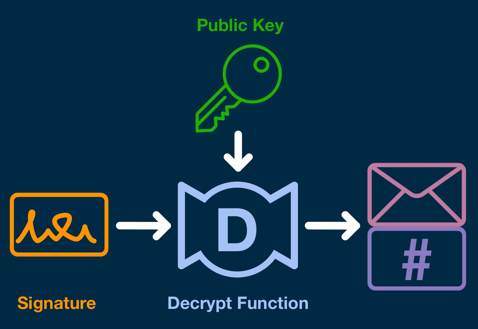 To begin, we need to undo the encryption process, which transformed our combined message-hash into a single piece of opaque data. And so, the verifier feeds the signature and the signers public key into the decryption function.