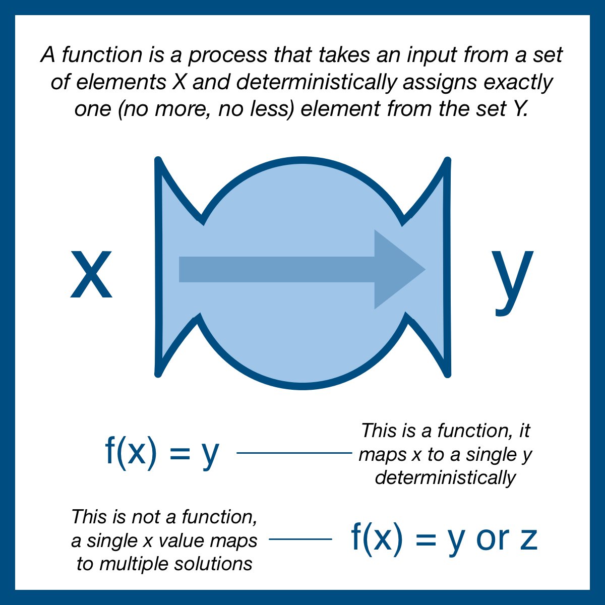 A function is a process that takes an input from a set of elements X and deterministically assigns exactly one (no more, no less) element from the set Y.