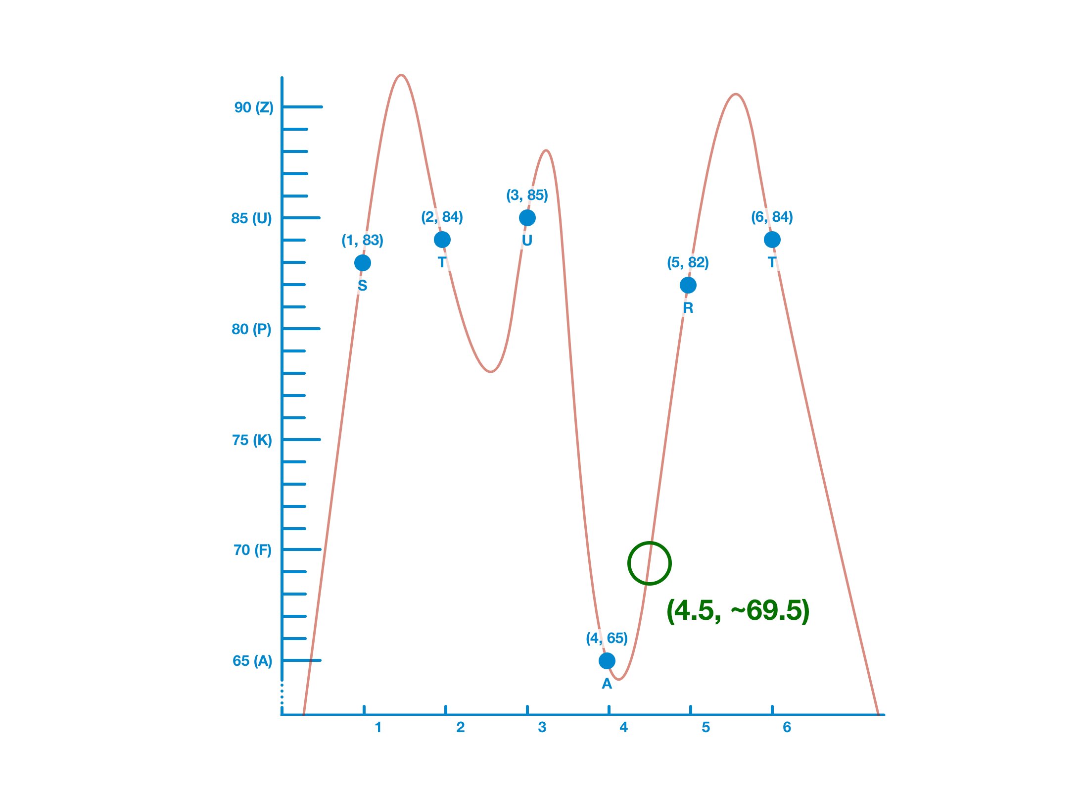 When x = 4, y = 65 - which refers to a real datapoint (A).