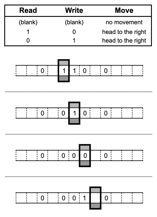 If we run our instruction two more times, we'll find ourselves at a blank space. Our Turing machine will follow our instruction and wait endlessly.