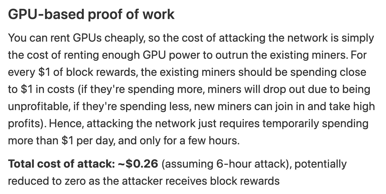Attack method: rent GPUs to out-mine the existing miners; control the chain long enough to make changes.