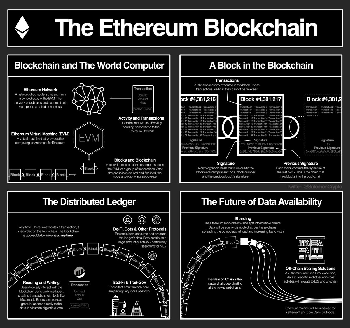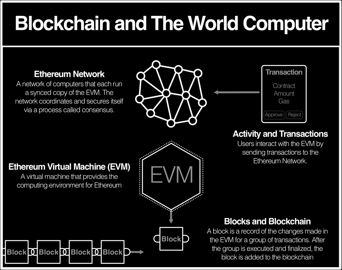 The nodes provide the hardware, the Ethereum Virtual Machine (EVM) provides the virtual computer and the blockchain records Ethereum's history.