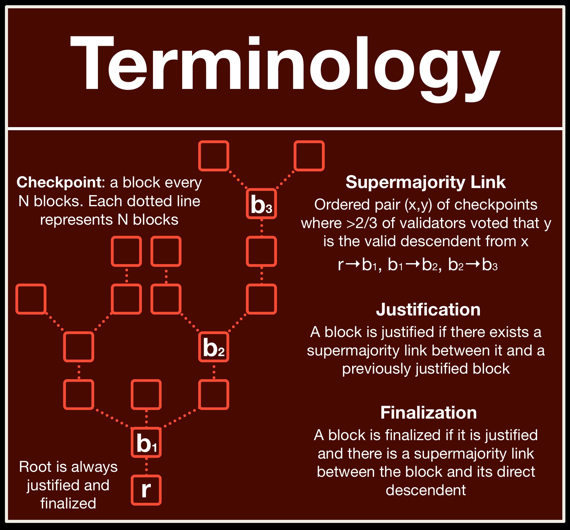 Rather than finalizing blocks, Casper finalizes "checkpoints," a single block once every N blocks (N = 32 blocks for PoS). The Casper equivalent of pBFT's voting is called a "supermajority link," meaning >2/3s of validators confirmed the validity of the checkpoint.