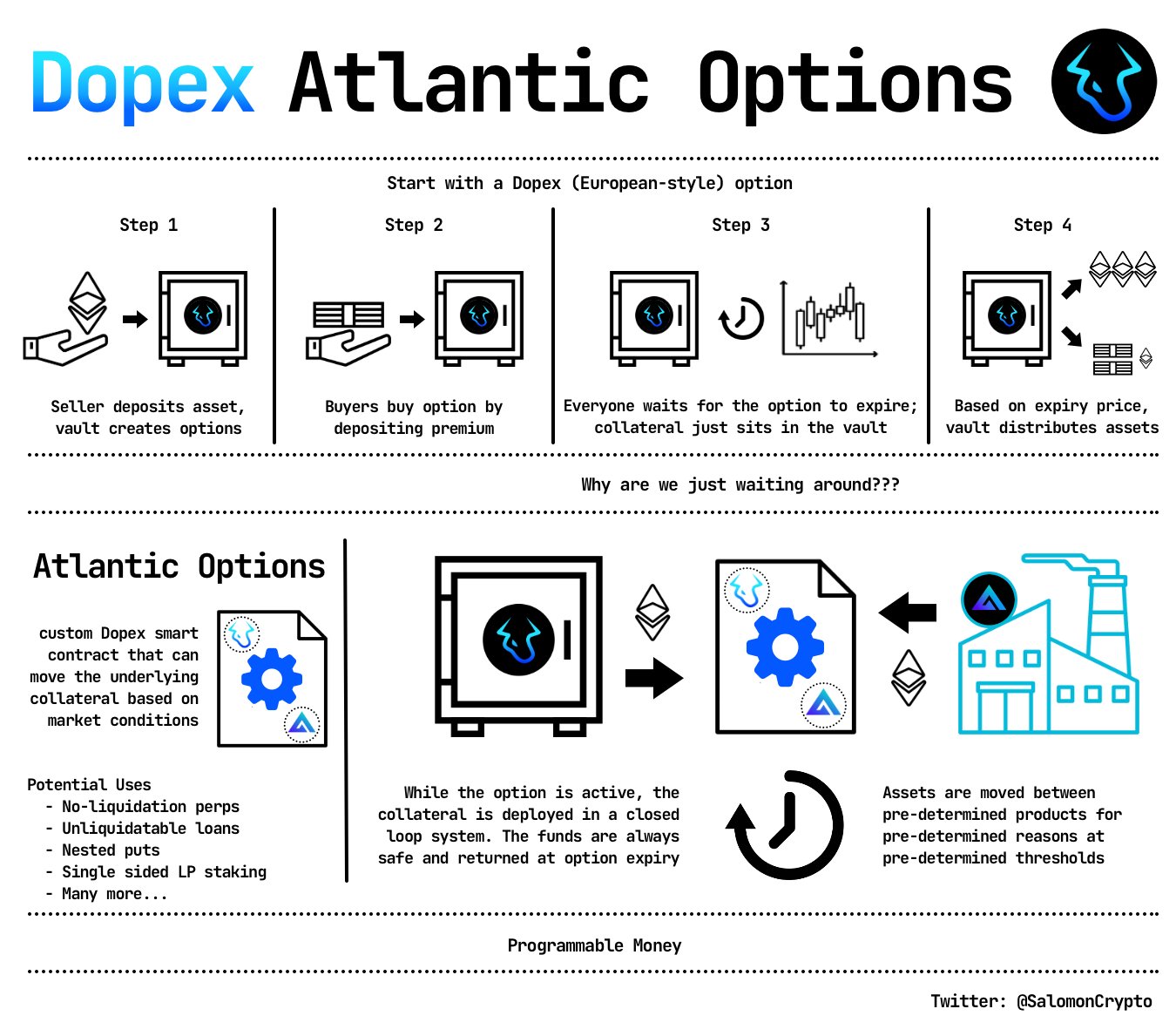 Dopex Atlantic Options are smart contracts that pair a Dopex-style option with another (white labeled, custom integrated) De-Fi product.