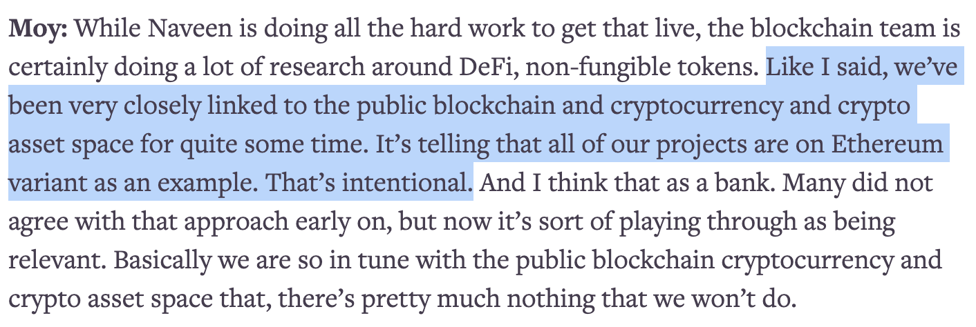 We know that J.P. Morgan is interested in De-Fi enough to be testing real-world transactions on a public blockchain. They picked Polygon, unimpeachable Ethereum zealots.