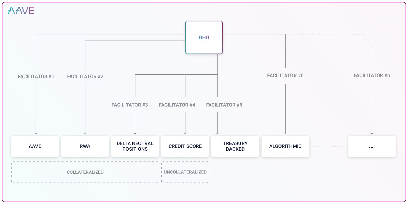 "Facilitators" are whitelisted entities that can trustlessly mint and burn GHO. Thus, Aave can both stabilize GHO and farm yield automatically.