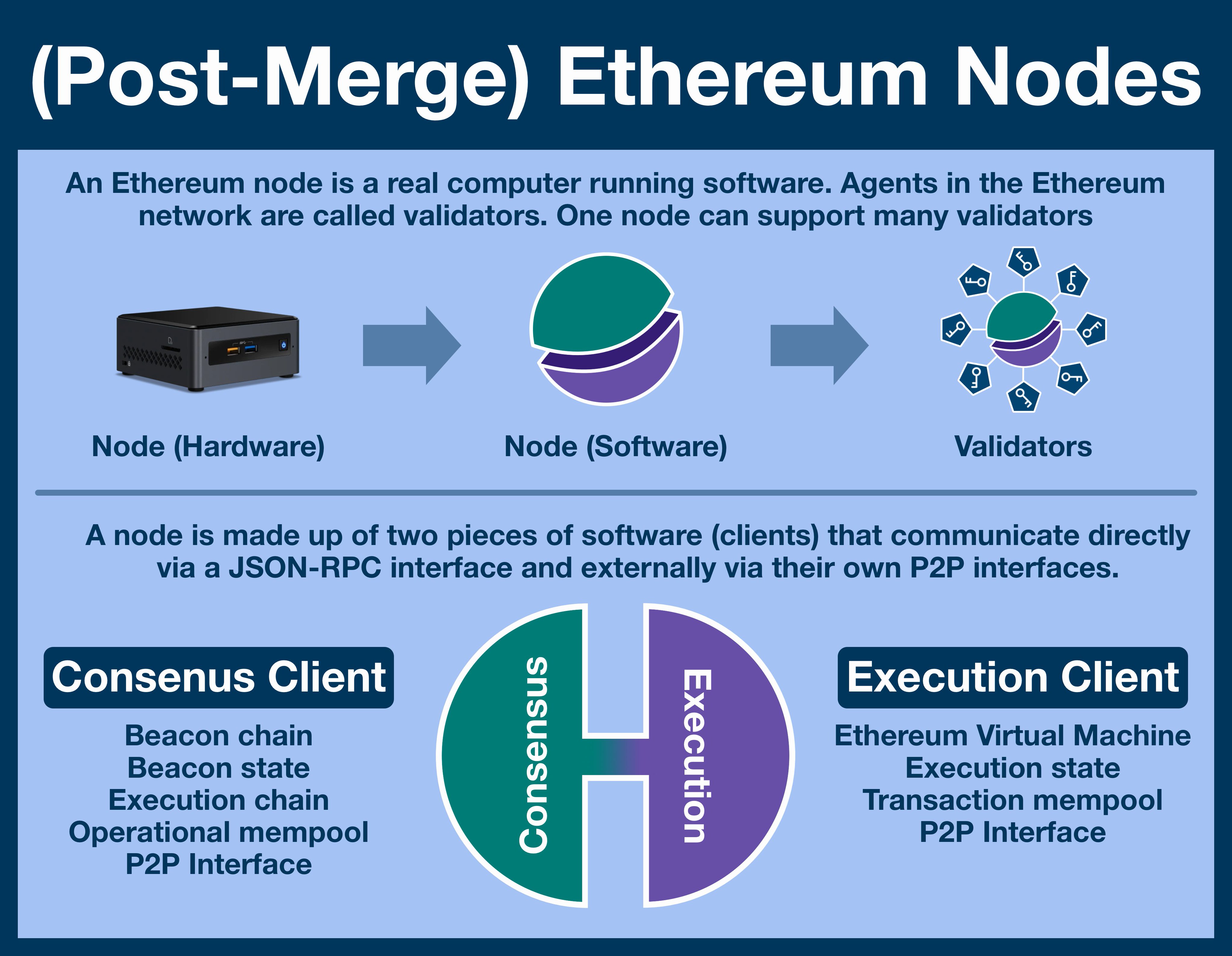 A node is a real computer in the world that runs the specific software that makes Ethereum possible. A single node runs two pieces of software: a consensus client and an execution client (responsible for operating the EVM).
